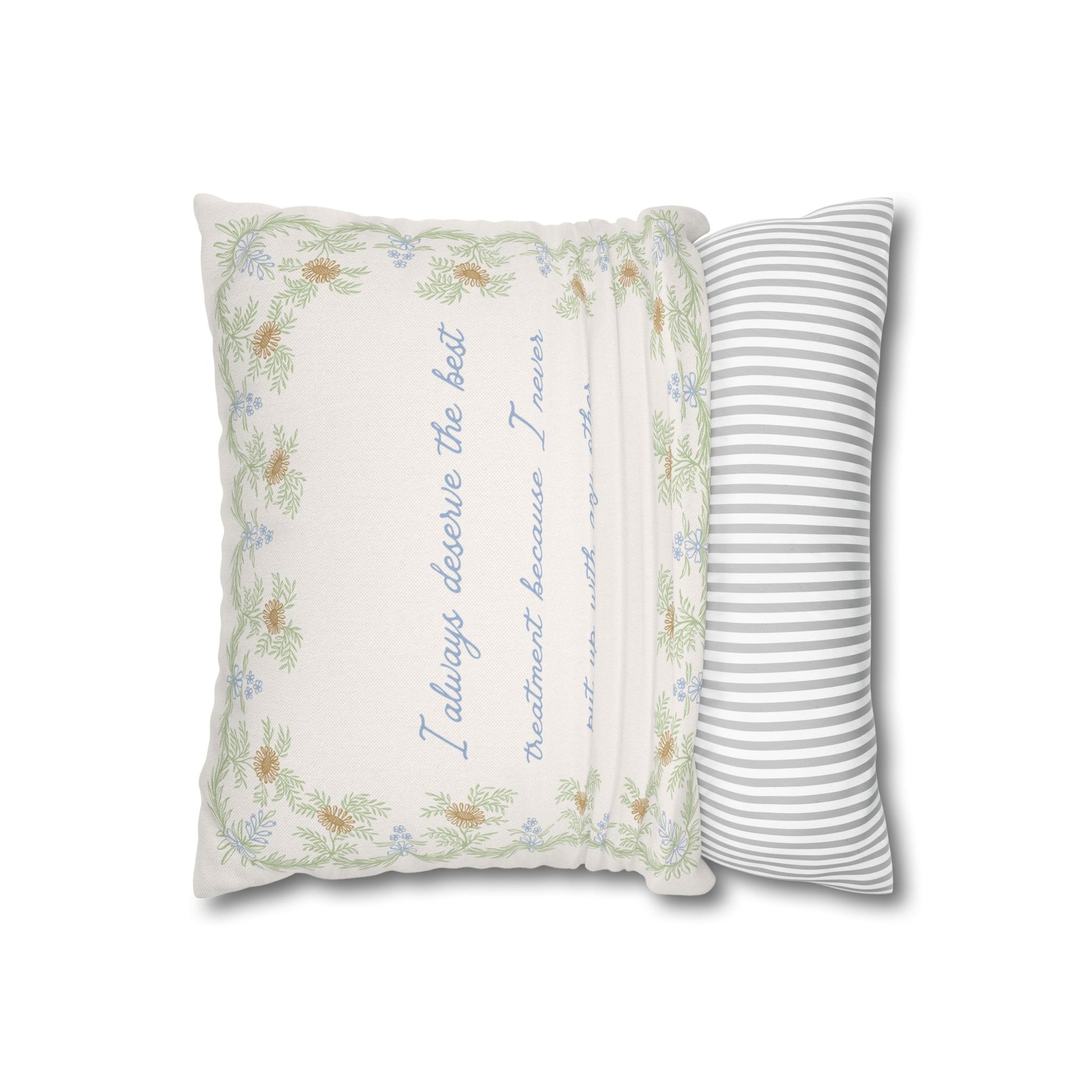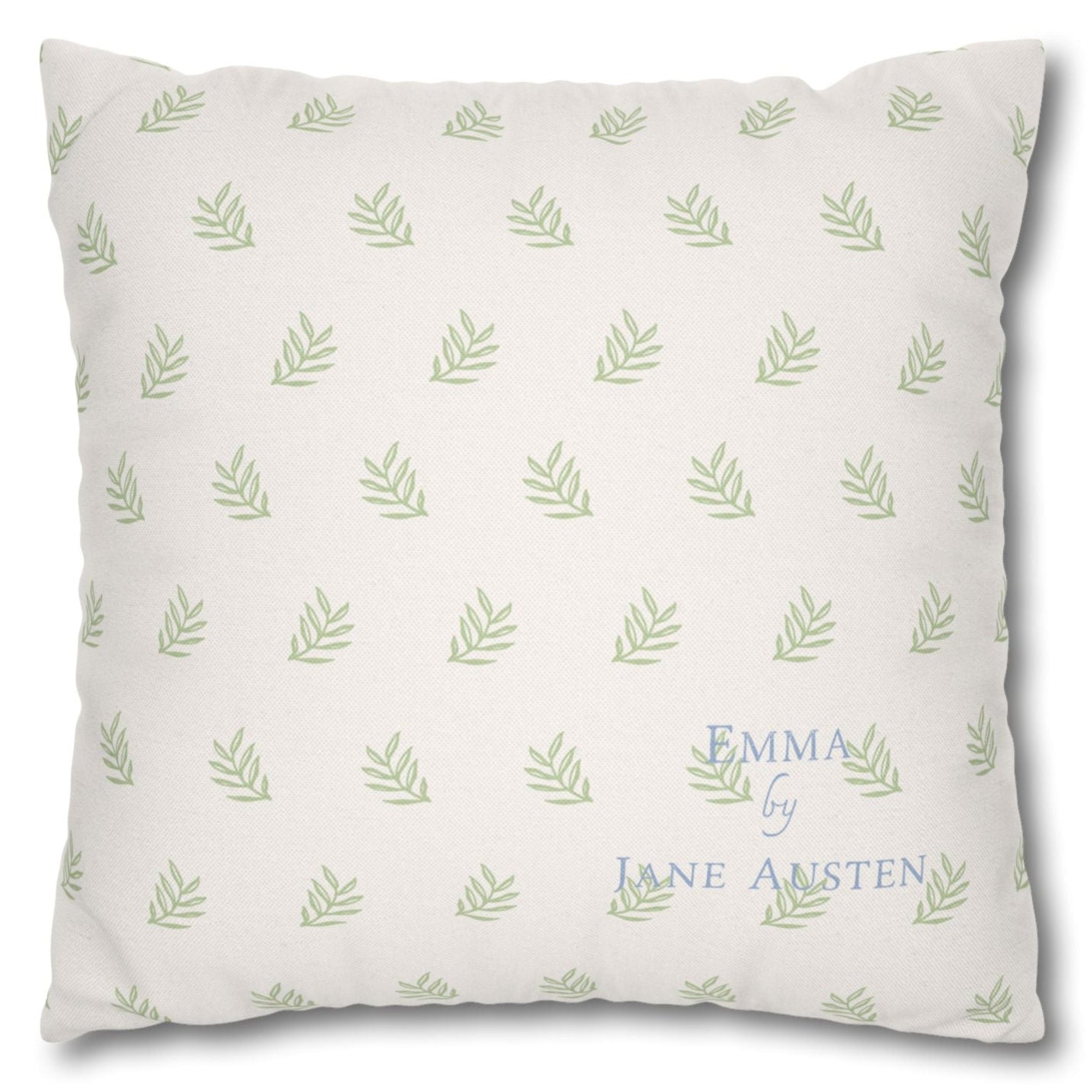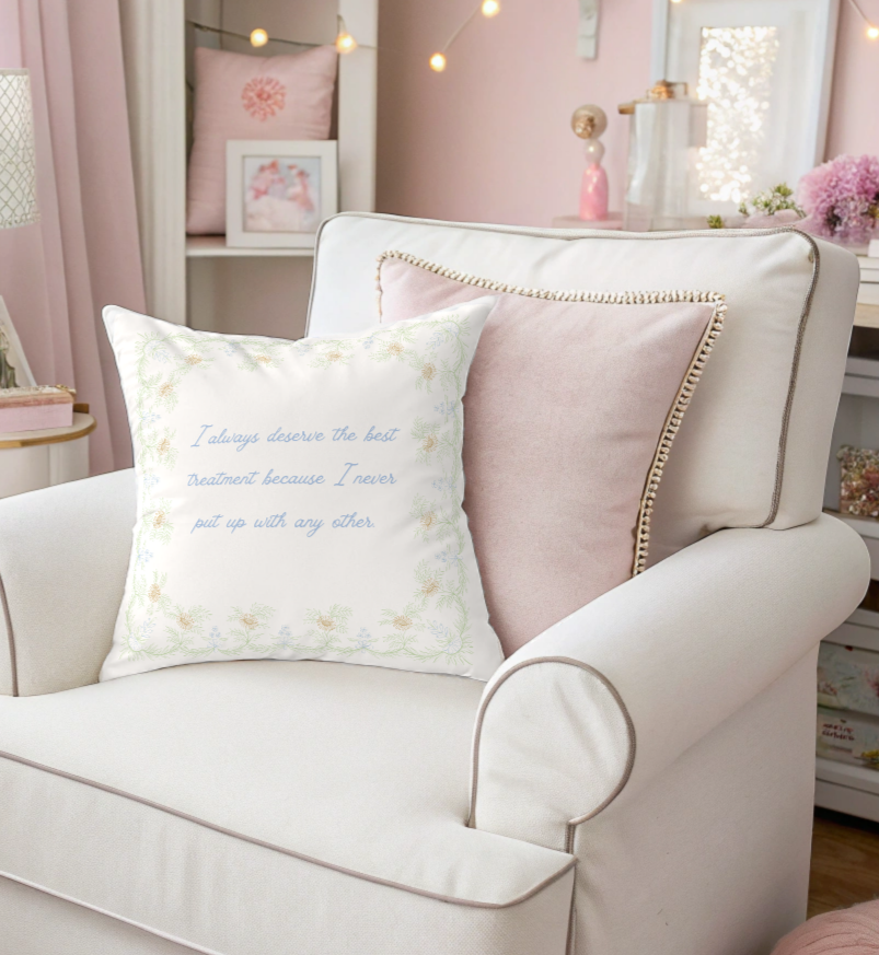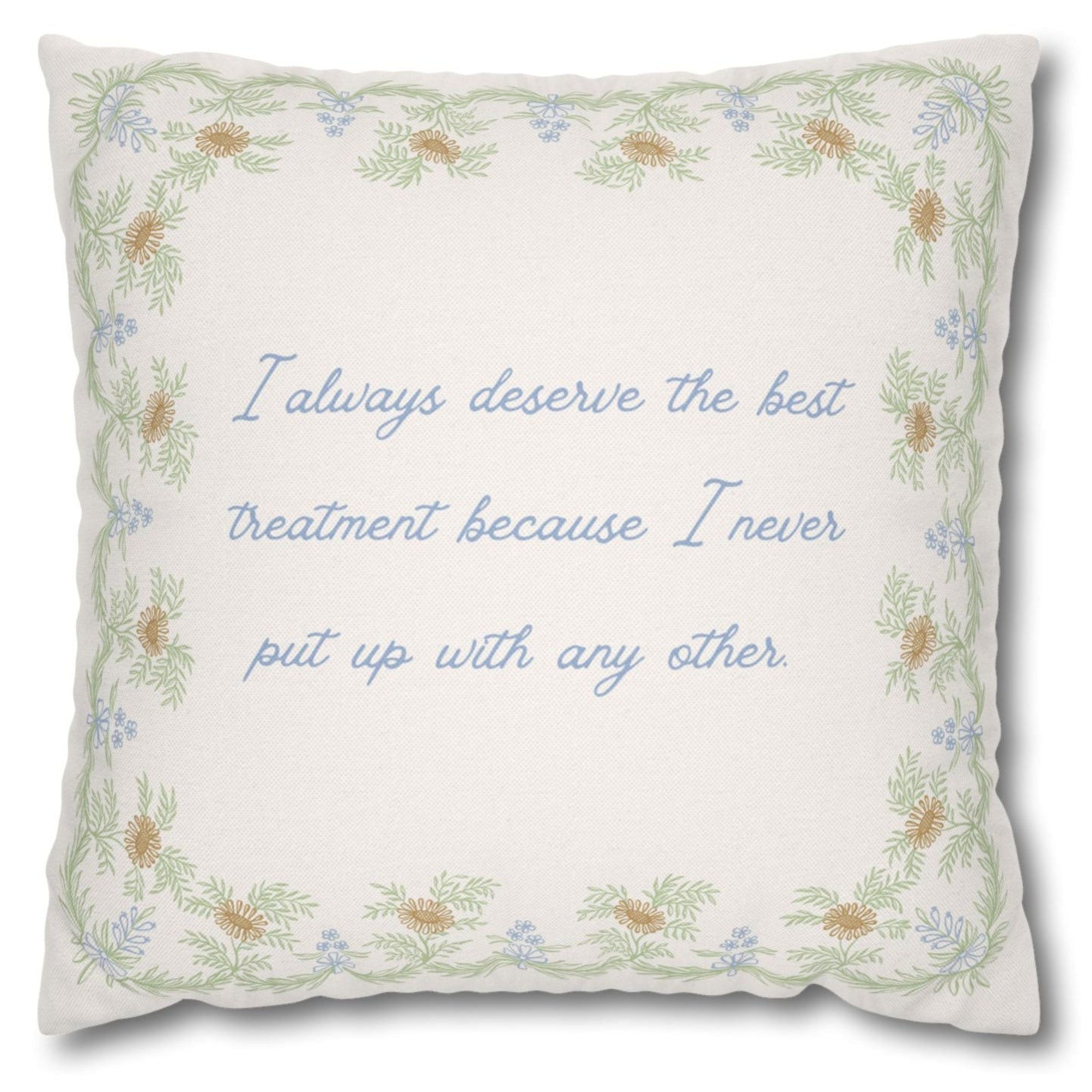 A pillowcase with a quote from Emma by Jane Austen, "I always deserve the best treatment because I never put up with any other." Set against a design inspired by 18th-century floral embroidery in pastel colors. The back features a matching floral pattern, with the novel title and author printed in the corner. PILLOW NOT INCLUDED.