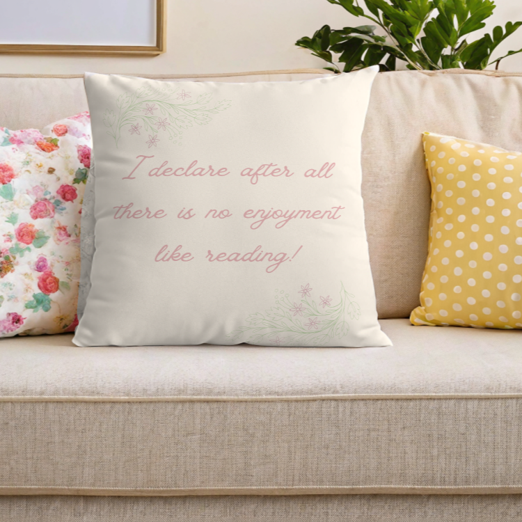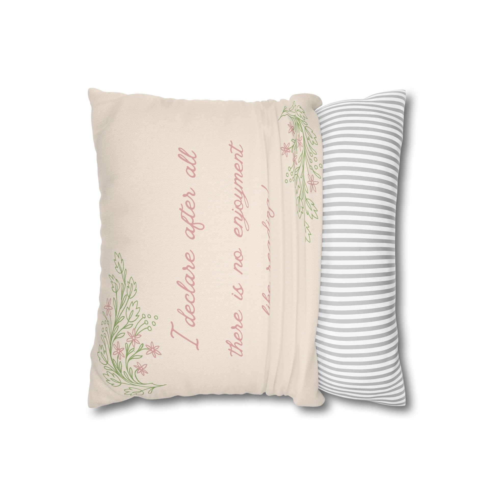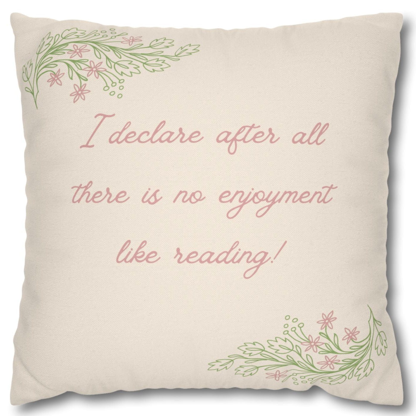 A pillowcase with a quote from Pride and Prejudice by Jane Austen, "I declare after all there is no enjoyment like reading!" Set against a design inspired by 18th-century floral embroidery in pastel colors. The back features a matching floral pattern, with the novel title and author printed in the corner. PILLOW NOT INCLUDED.