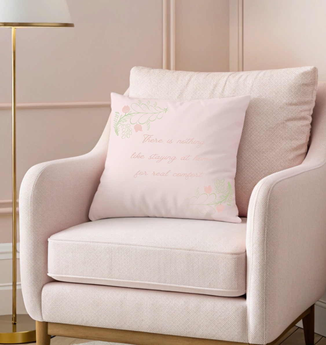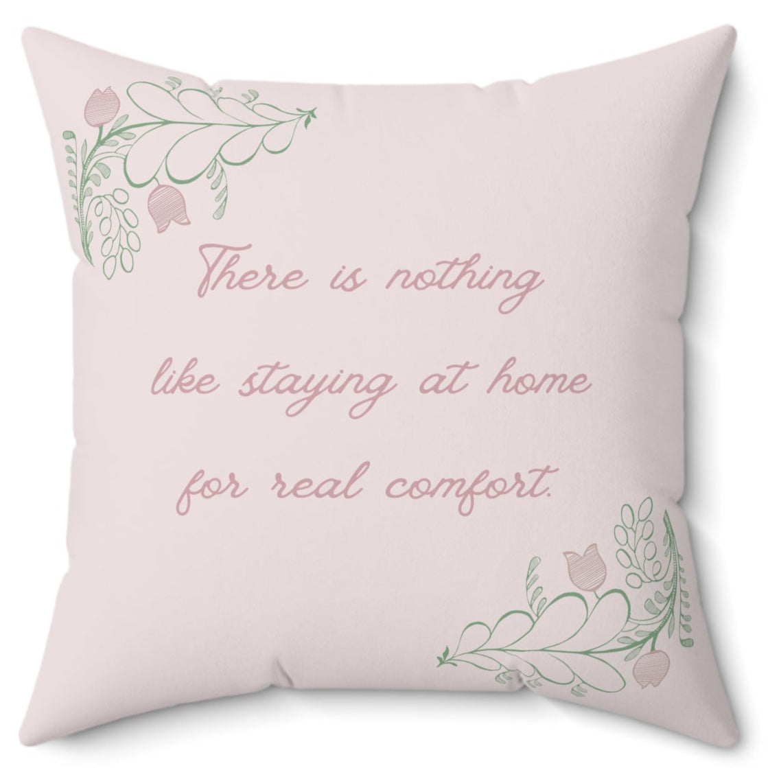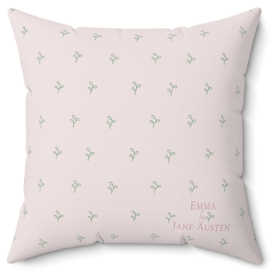 A throw pillow with a quote from Emma by Jane Austen, "There is nothing like staying at home for real comfort." Set against a design inspired by 18th-century floral embroidery in pastel colors. The back features a matching floral pattern, with the novel title and author printed in the corner.