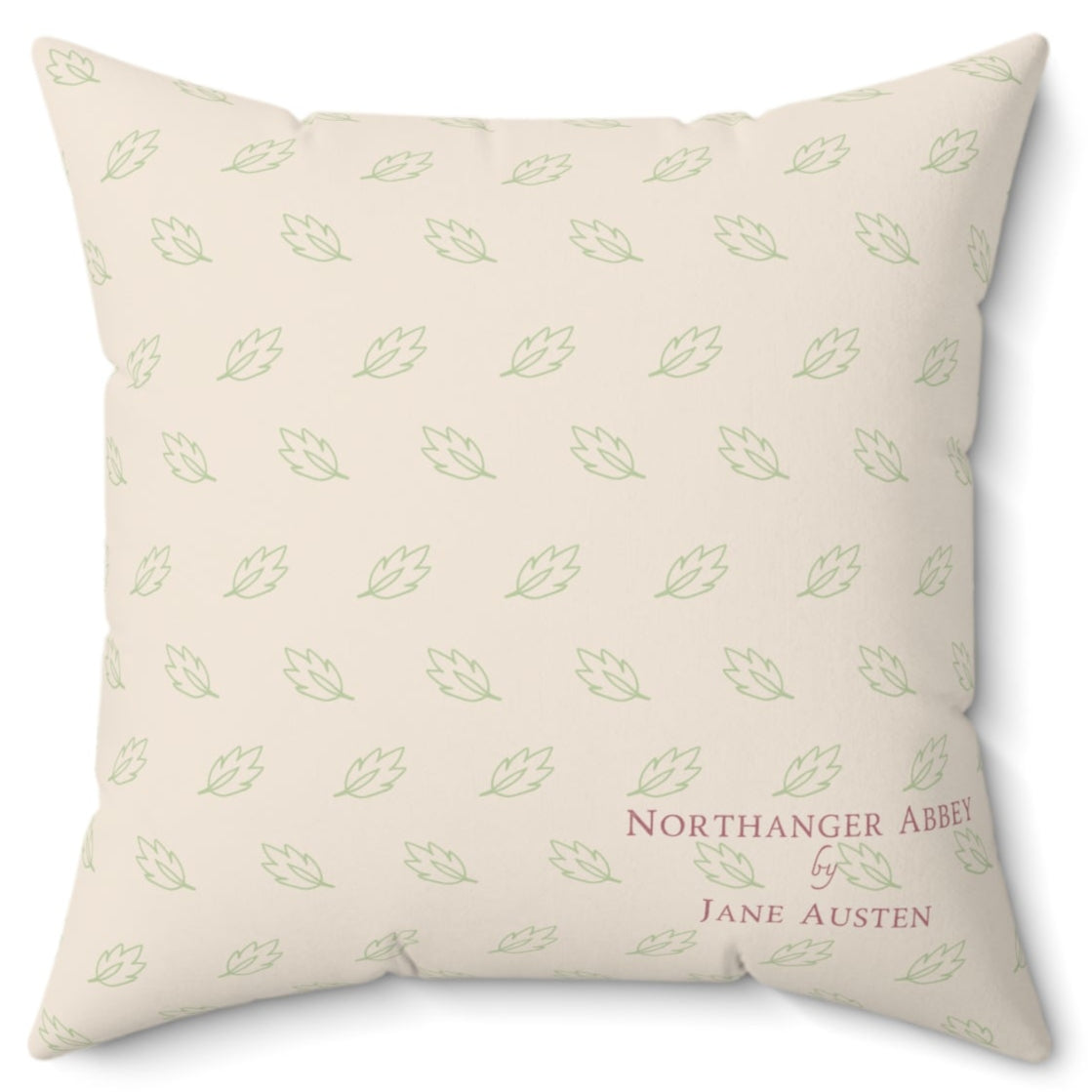 A throw pillow with a quote from Northanger Abbey by Jane Austen, "Friendship is certainly the finest balm for the pangs of disappointed love." Set against a design inspired by 18th-century floral embroidery in soft pastel colors. The back features a matching floral pattern, with the novel title and author printed in the corner.