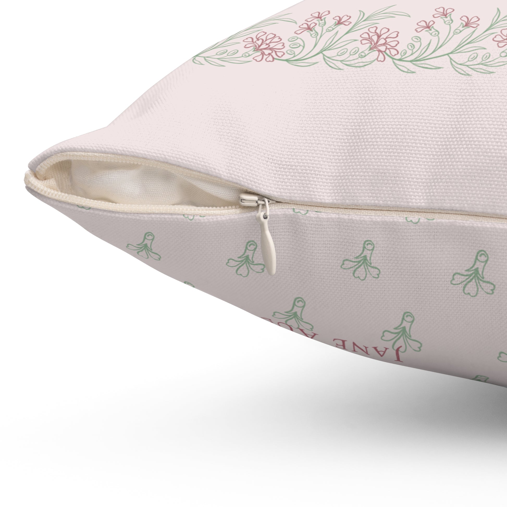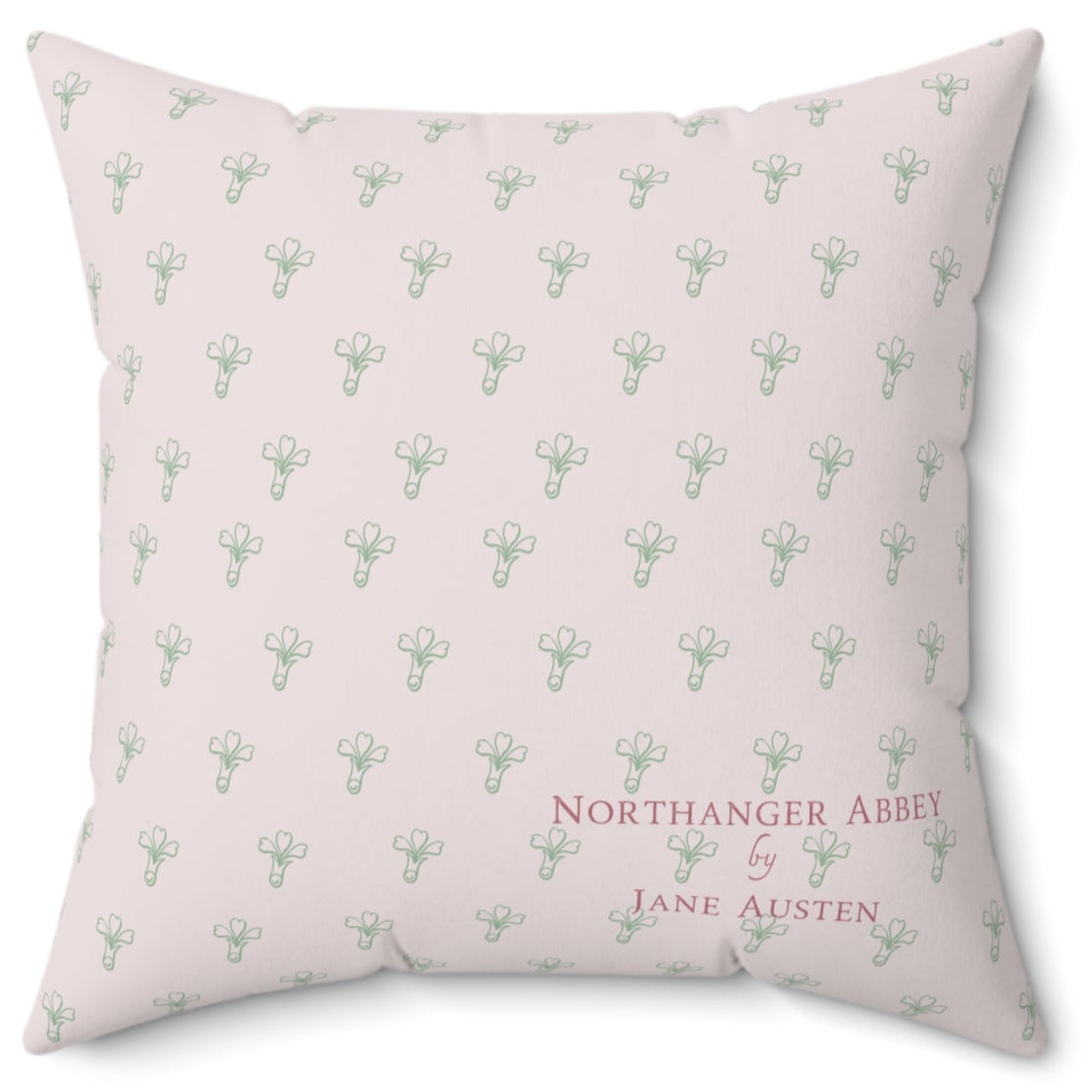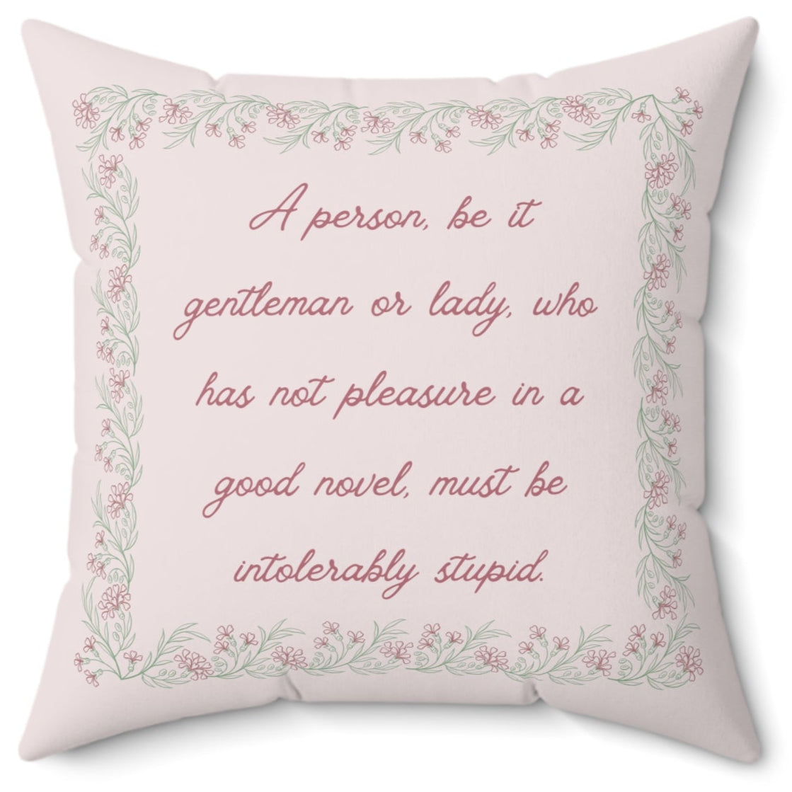 A throw pillow with a quote from Northanger Abbey by Jane Austen, “A person, be it gentleman or lady, who has not pleasure in a good novel, must be intolerably stupid.” Set against a design inspired by 18th-century floral embroidery.The back features a matching floral pattern, with the novel title and author printed in the corner.